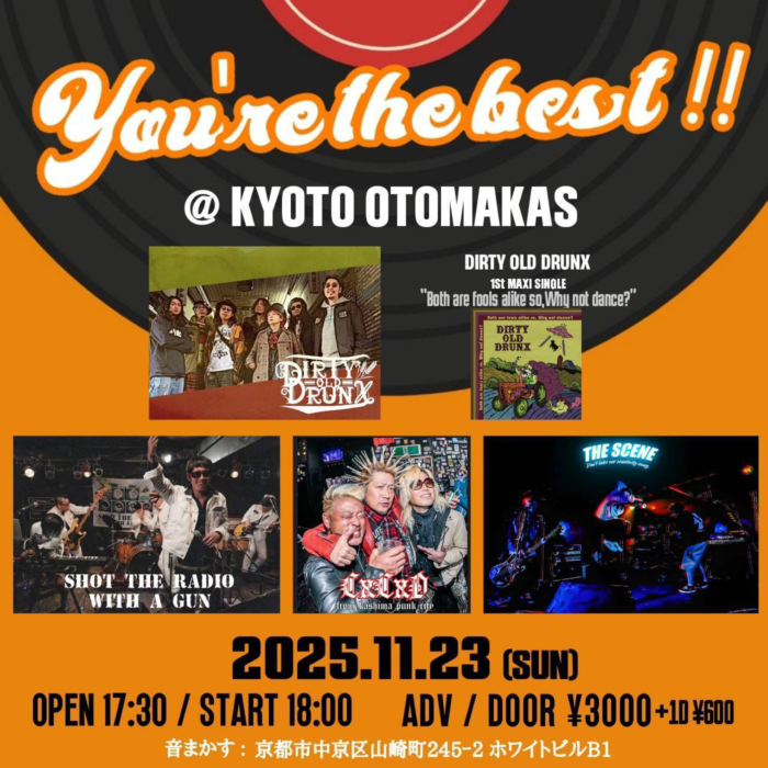 11月23日(日)イベント開催のお知らせ ★11月23日(日) 『You’re the best !!』 DIRTY OLD DRUNX レコ発 OPEN/START 17:30/18:00 ADV/DOOR ¥3000(D別) [Act] CxCxD DIRTY OLD DRUNX SHOT THE RADIO WITH A GUN THE SCENE