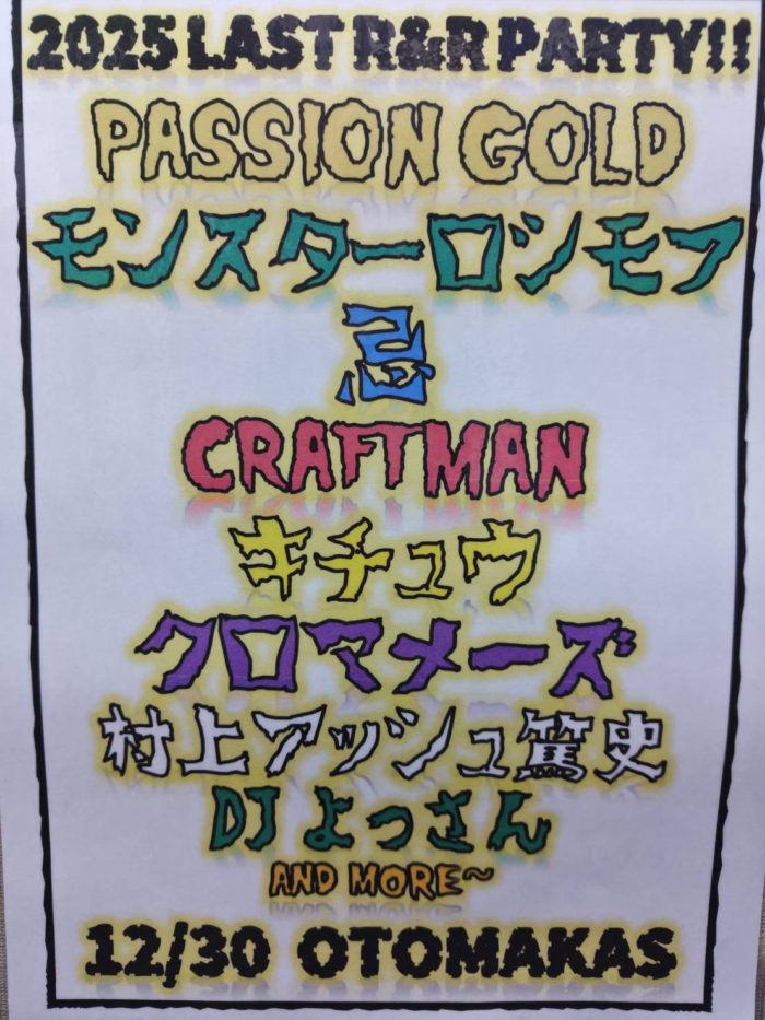 12月30日(火)イベント開催のお知らせ ★12月30日(火) ROCK A GO GO企画 『2025 LAST R&R PARTY!!』 OPEN/START 17:00/17:30 ADV/DOOR ¥3000/¥3500(D別) [Act] PASSION GOLD モンスターロシモフ 忌 CRAFTMAN キチュウ クロマメーズ 村上”アッシュ”篤史楽団 [DJ] よっさん