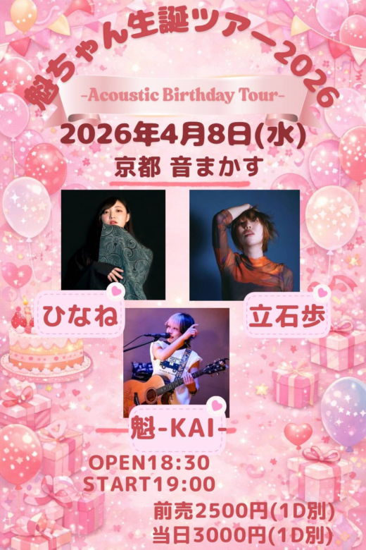 ★4月8日(水) 音まかす11th Anniversary!! 『魁ちゃんの生誕ツアー 京都編』 OPEN/START 18:30 ADV/DOOR ¥2500/¥3000(D別) [Act] 魁-KAI-(ALLiCA) 立石歩 ひなね チケット予約はTigetにて https://tiget.net/events/ […]