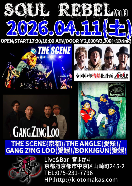 ★4月11日(土) 音まかす11th Anniversary!! 『SOUL REBEL vol.19』 OPEN/START 17:30/18:00 ADV/DOOR ¥2800/¥3300(D別) [Act] THE SCENE(京都) THE ANGLE(愛知) GANG ZING LOO(愛媛) BOKKIGU […]