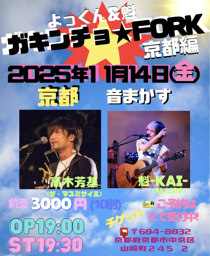 11月14日(金)イベント開催のお知らせ ★11月14日(金) よっくん&魁『ガキンチョ★フォーク』 OPEN/START 19:00/19:30 ADV/DOOR ¥3000(D別) [Act] 高木芳基(ザ・マスミサイル) 魁(ALLiCA)